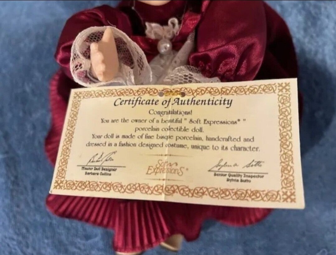 This is a beautiful Soft Expressions Porcelain Doll with Certificate of Authenticy. This beautiful windup Doll plays a soothing tune as she becomes alive with the music. Great for doll collectors.