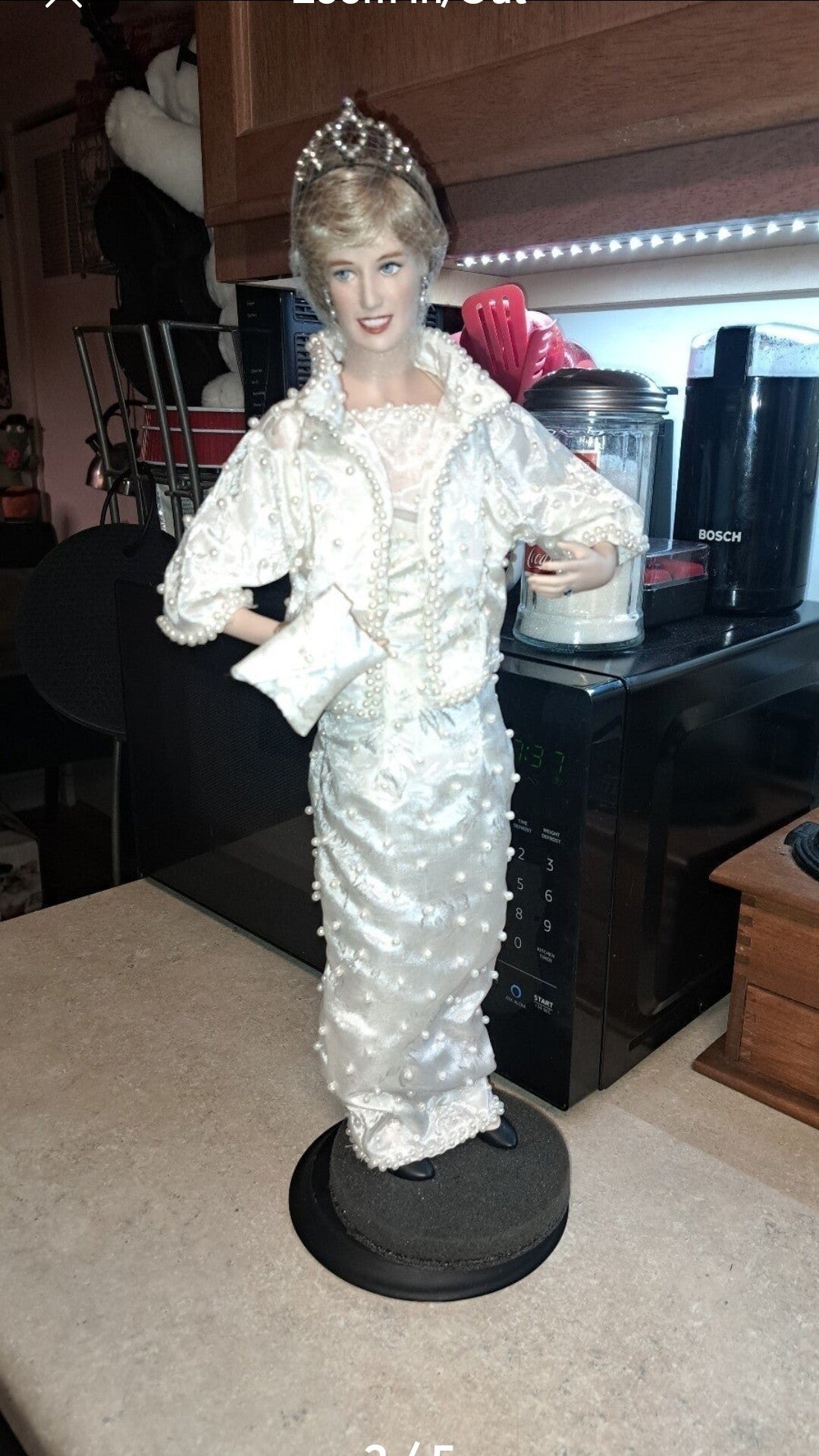The Franklin Mint Collection Princess Diana Porcelain Doll featuring a stunning beaded white formal dress with a matching beaded jacket. It also comes with a gorgeous beaded purse matching her ensemble, including a beautiful silver crown included. This beautiful doll from Franklin Mint 20" or larger princess Diana porcelain doll. What a beautiful collectors piece. Clothing is slightly larger than the doll shown in photos.