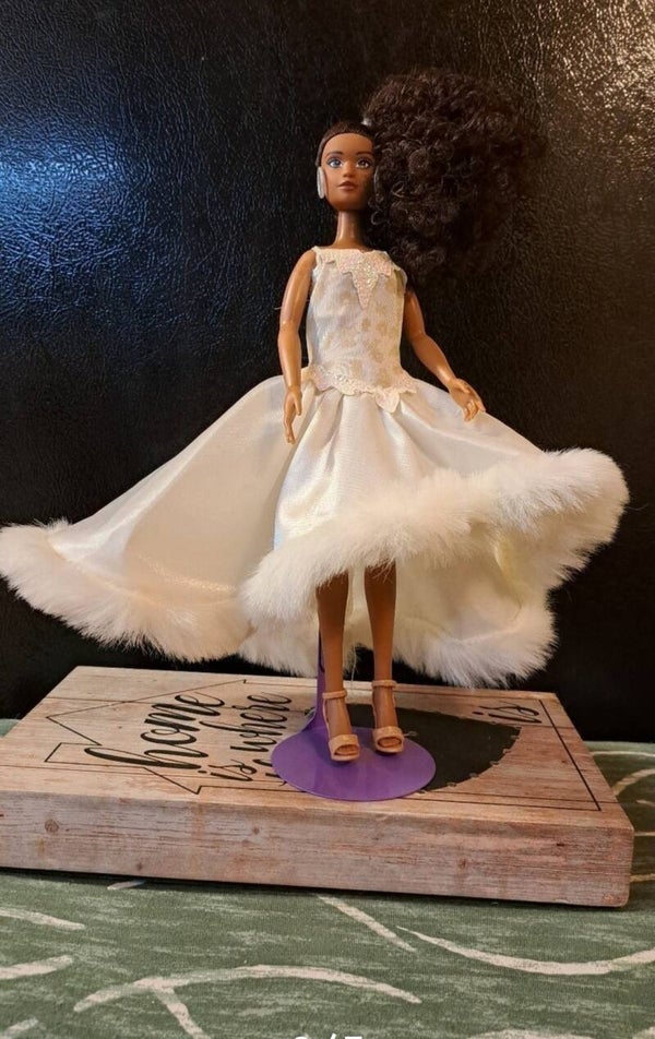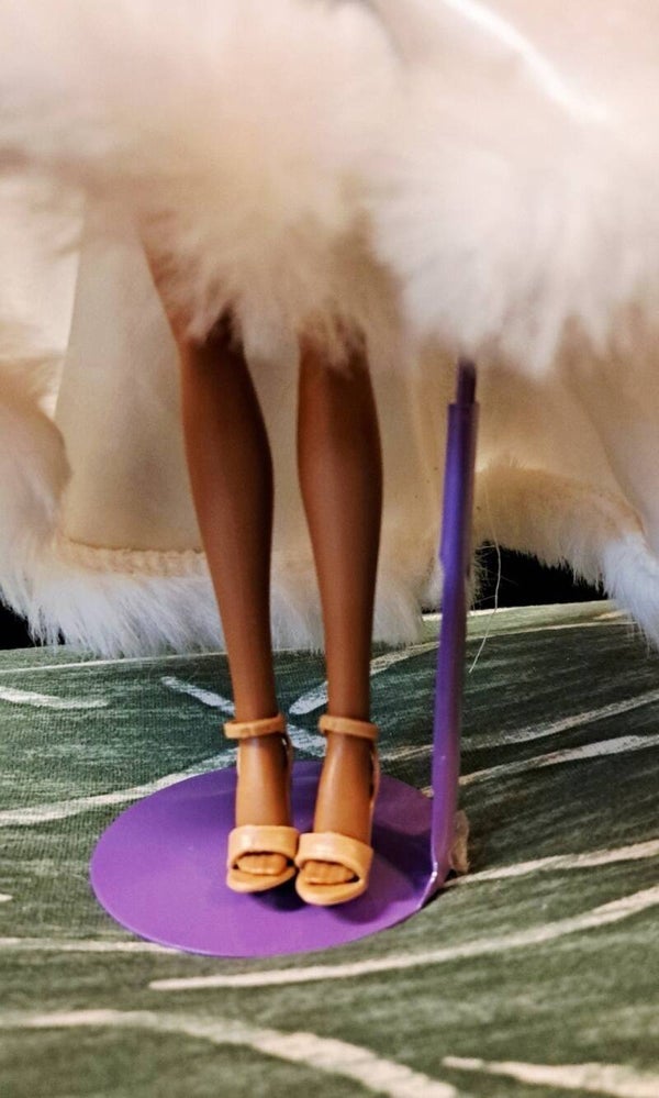 This beautiful black barbie is in a gorgeous re- dressed Naturalista doll wearing a cream and fur lined dress that has the Marilyn Monroe dazzle to it and comes with the high heels as well. Great for doll collectors.