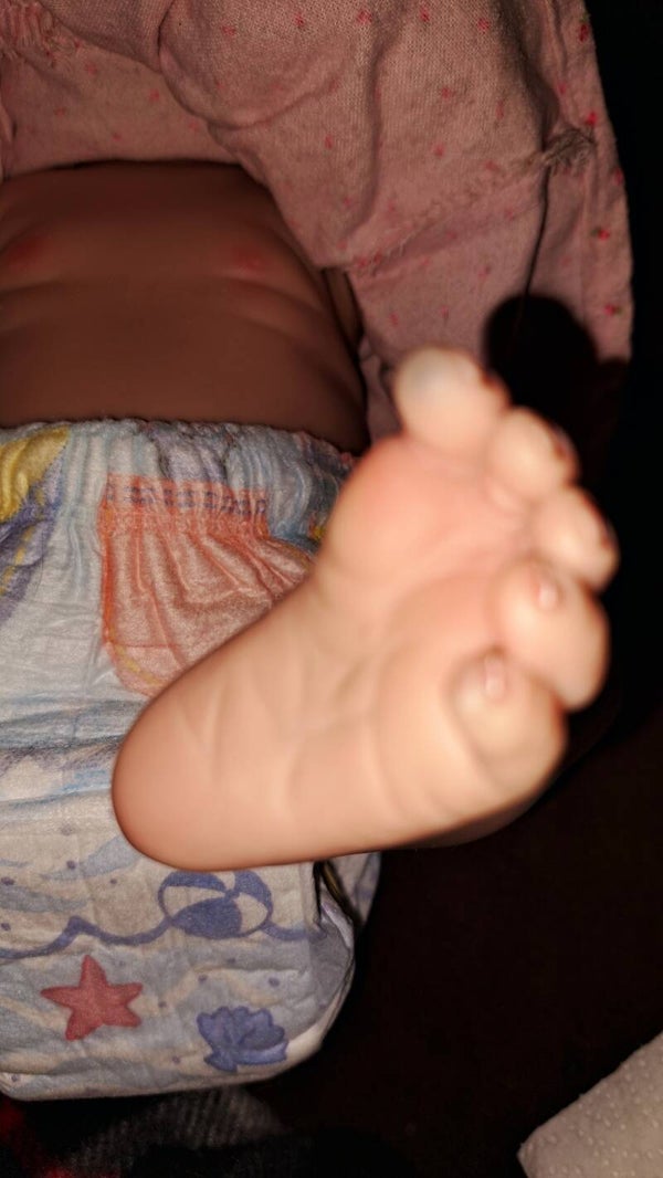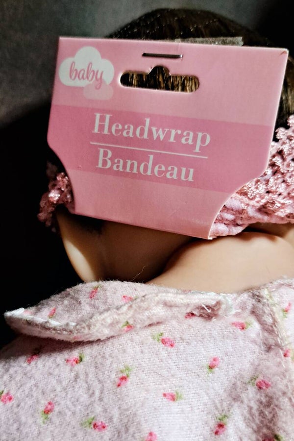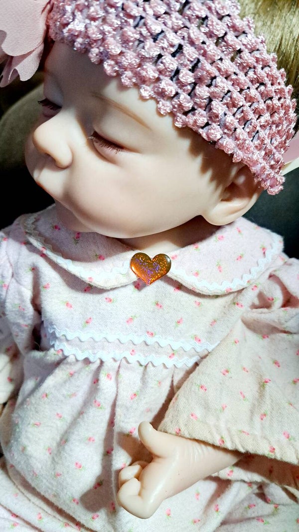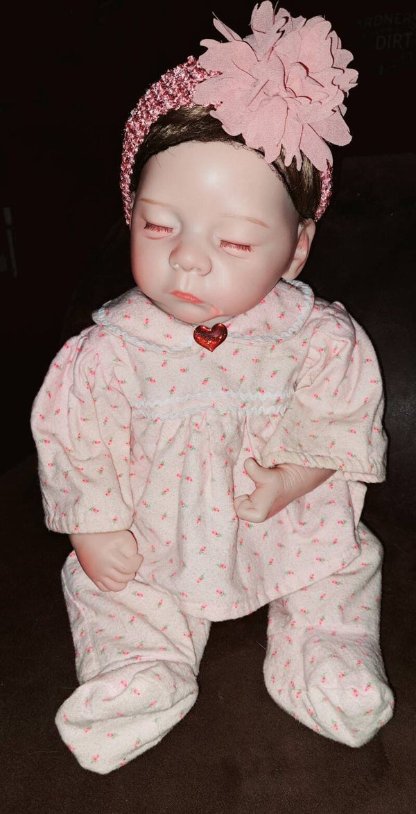 Beautiful soft vynle baby girl that i have re-inspired. She came very rough around the edges, but with a little loves and patience, I've cleaned, sanitized and made a few additions. She comes with her original hair that has been washed and conditioned as well as a new wig added unattached, but combed and blended with her original hair. She comes with the original outfit and a brand new headband that can be used on a child. She is a beauty. She has blue blemishes that are pictured, but can be seen as a birthmark.