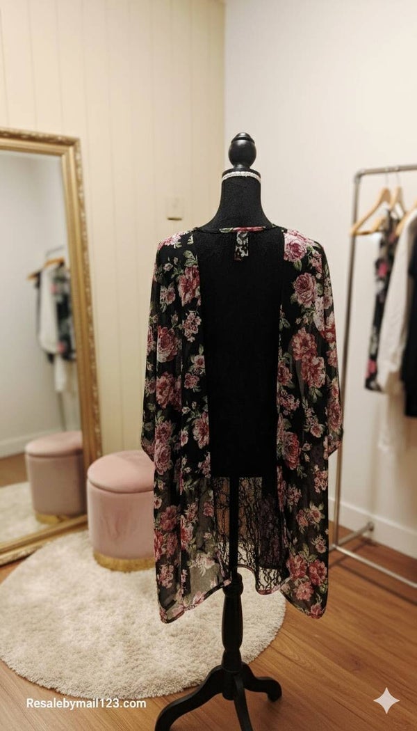 No Boundaries Kimono Style Cardigan Black Floral Sheer & Lace Cover Up (Pre-owned)